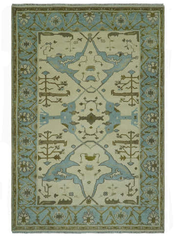 Beige and Aqua Hand Knotted 6x9 Traditional Oriental Oushak wool area rug