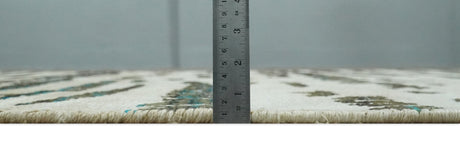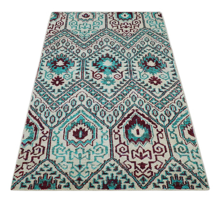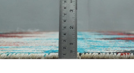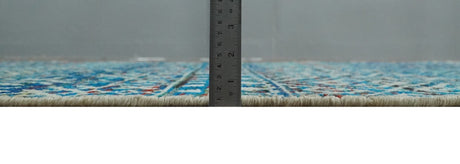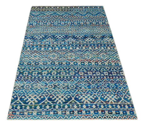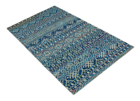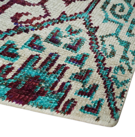 5x8 Hand Knotted Ivory, Blue and Teal Modern Geometric Contemporary Recycled Silk Area Rug | OP102