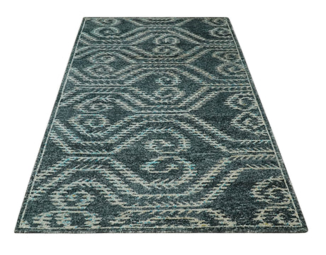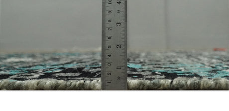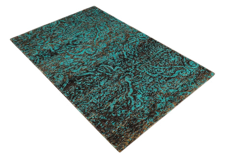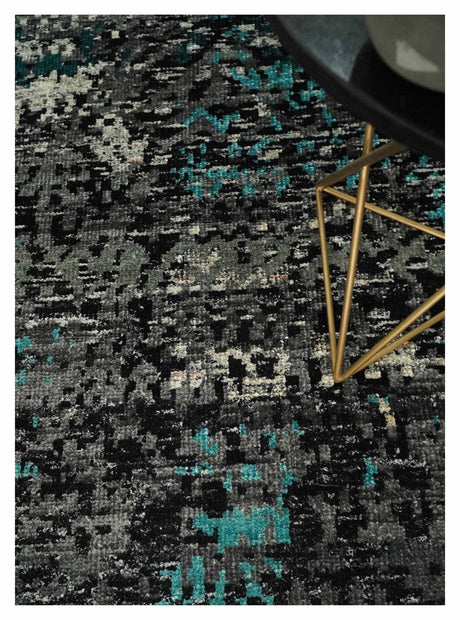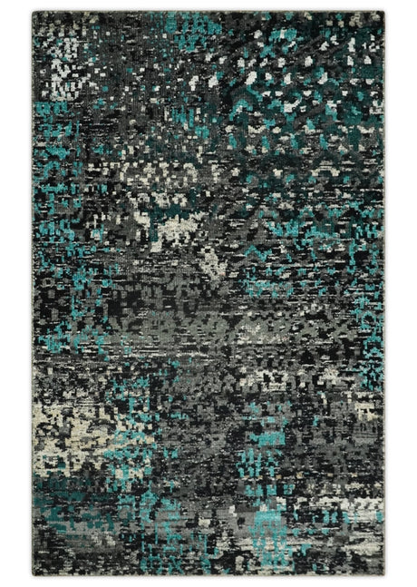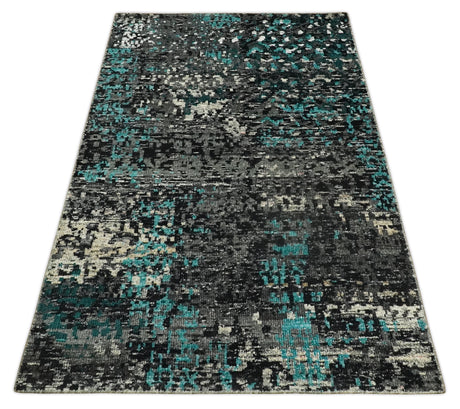 5x8 Hand Knotted Black, Ivory and Teal Modern Style Contemporary Recycled Silk Area Rug | OP119
