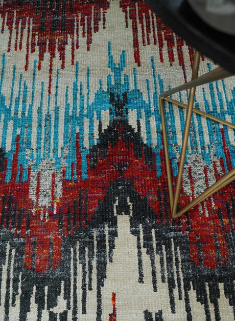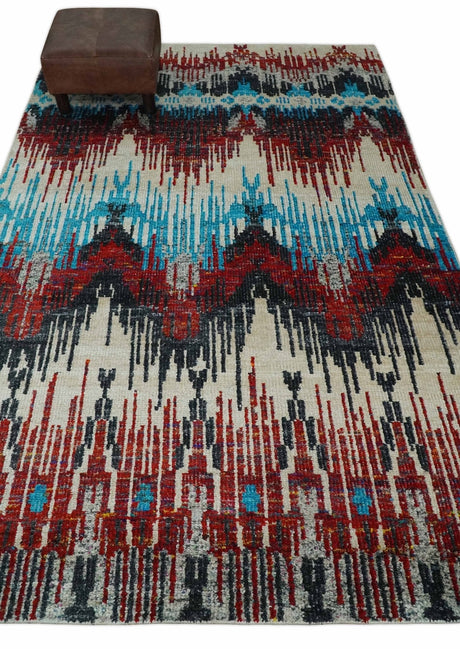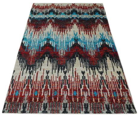 5x8 Hand Knotted Ivory, Blue and Maroon Modern Abstract Contemporary Recycled Silk Area Rug | OP99
