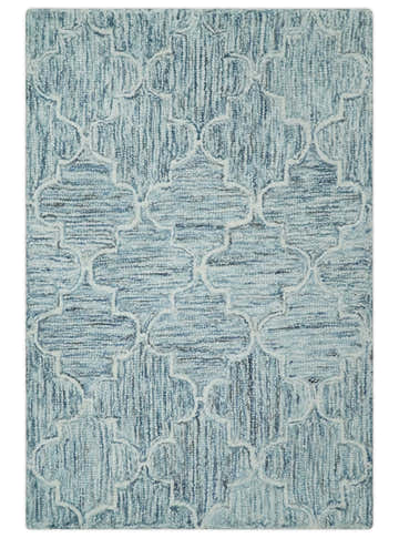 Ivory and Blue Modern Geometric Hand Tufted Multi Size Natural Wool Area Rug