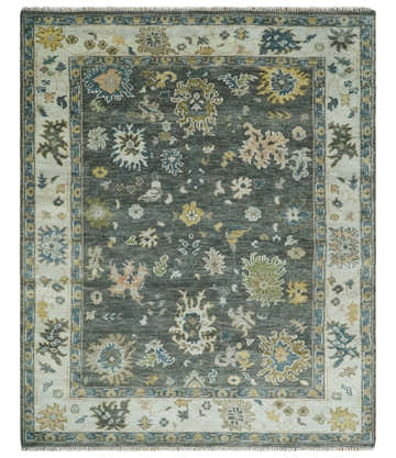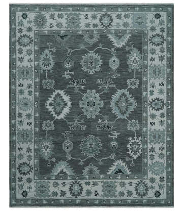 Antique Style Custom Made Charcoal, Silver and Green Hand Knotted Oriental Oushak Wool Area Rug