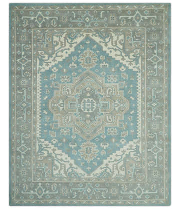 Custom Made Hand Knotted Blue, Ivory, Camel and Gray Traditional Heriz wool rug