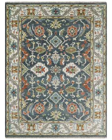 • Custom Made Hand Knotted Teal, Blue and Ivory Traditional Oushak Wool Area Rug