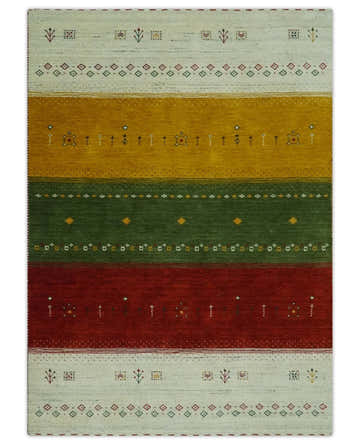 • Custom Made Tribal Gabbeh Ivory, Gold, Green and Maroon Geometrical Stripes Design Wool area Rug