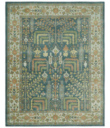 Custom Made Tree of life Traditional Teal, Silver, Green and Dark Peach wool Rug