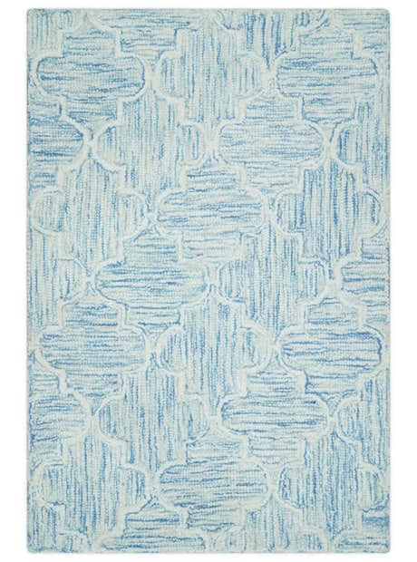 Custom Made Ivory and Blue Modern Geometric Hand Tufted Natural Wool Area Rug
