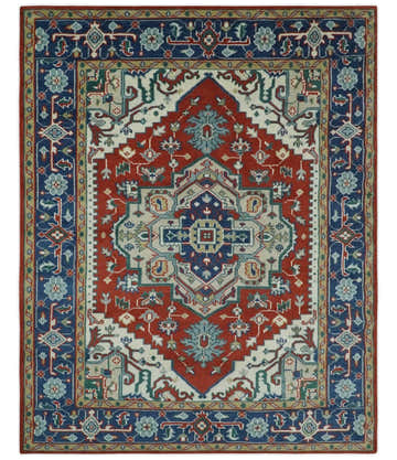 Custom Made Traditional Rust, Ivory and Blue Heriz Medallion Wool Area Rug