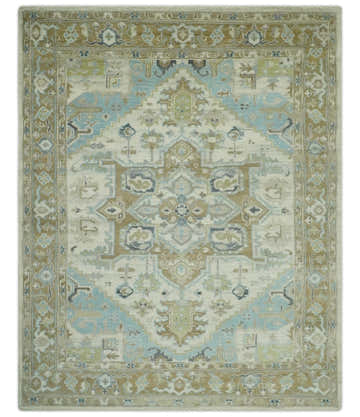Custom Made Hand Knotted Ivory, Olive and Light Blue Traditional Wool Area Rug