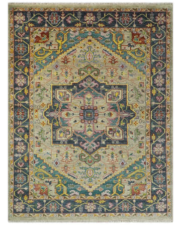 Custom Made Antique look Hand Knotted Camel, Teal and Charcoal Traditional Heriz Serapi Wool Rug