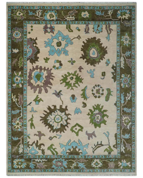 Royal Green and Ivory Custom Made Hand knotted Traditional Oushak wool Area Rug