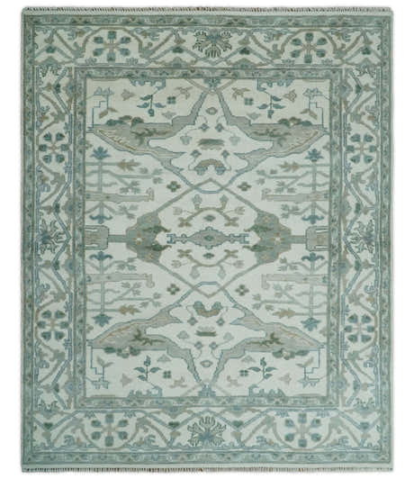 Custom Made Hand Knotted Oriental Oushak Ivory and Teal Wool Area Rug