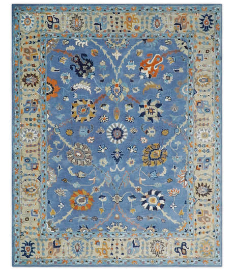 Traditional Blue and Camel Colorful Hand knotted Oushak Custom Made Wool Area Rug