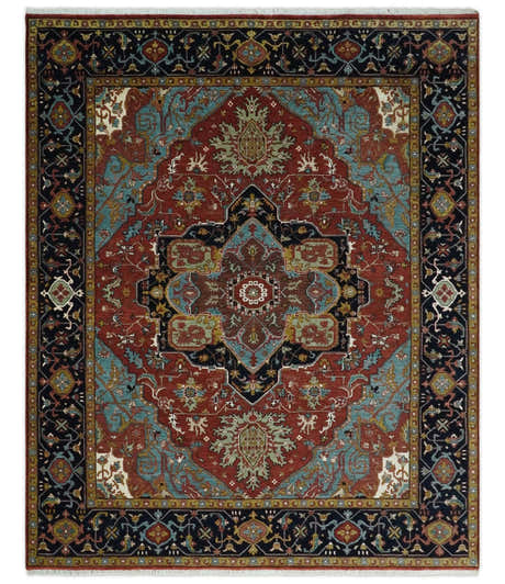 Hand Knotted Rust, Blue and Black Traditional Vintage Style Heriz Serapi Custom Made Wool Area Rug