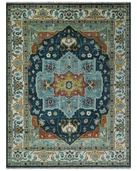 Hand Knotted Ivory, Blue and Rust Modern Traditional Heriz Serapi Multi Size Wool Area Rug