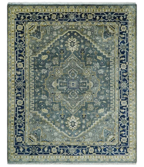 Custom Made Hand Knotted Antique Moss Gray Beige and Blue Traditional Heriz Serapi Wool Area Rug