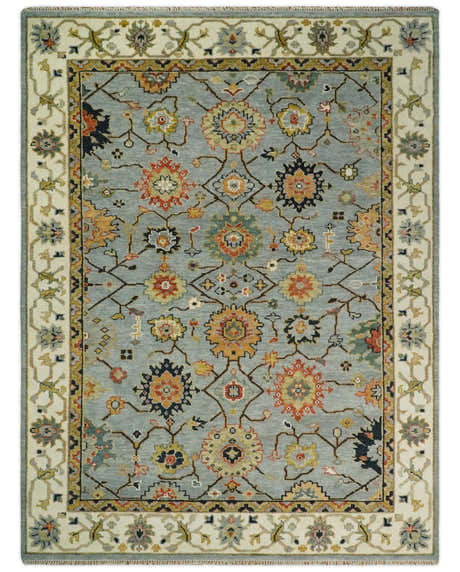 Rust, Ivory and Blue Hand Knotted Oriental Oushak Custom Made wool Area Rug