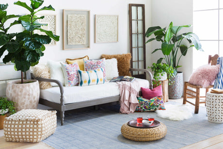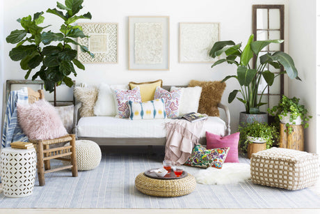 Decorating with boho decorative pieces such as pillow covers, poufs, furniture pieces, table lamps, mirrors, lights are a great way to express the chic charm of a simpler time.