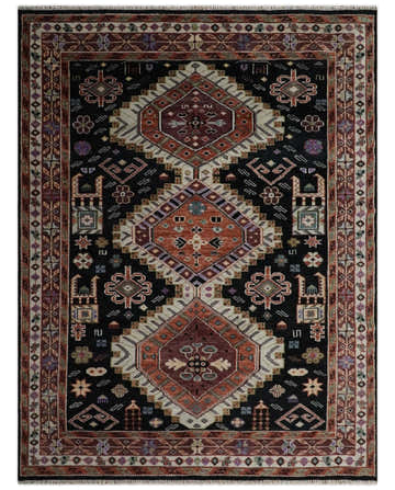 Hand Knotted Rust, Ivory and Black Traditional Heriz Wool Area Rug