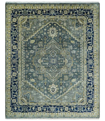 Antique look Blue, Ivory and Olive Traditional Heriz Medallion Multi Size wool Area Rug