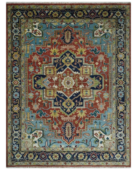 Custom Made Rust and Blue Traditional Medallion Hand Knotted Wool Area Rug
