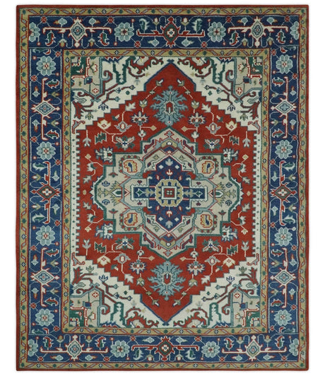 Custom Made Traditional Rust, Ivory and Blue Heriz Medallion Wool Area Rug