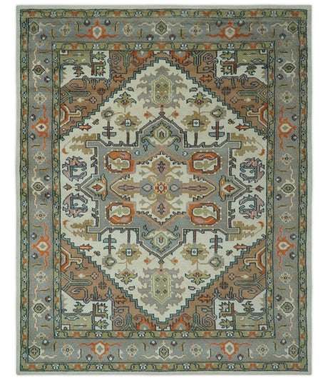 Custom Made Ivory, Silver, Peach and Olive Hand Knotted Traditional Heriz wool Area Rug