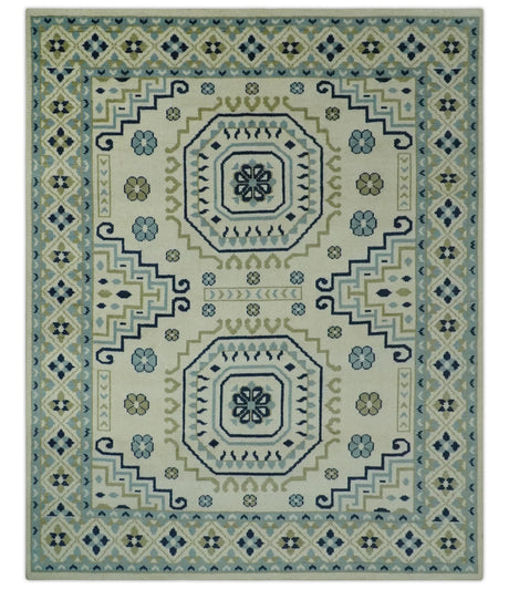 Ivory, Blue and Olive Traditional Mamluk design Custom Made wool area Rug