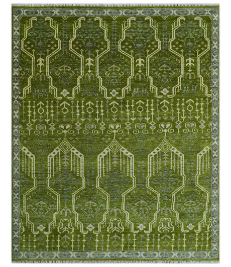 Contemporary Traditional Design Green And Beige Hand Knotted Custom Made Wool Rug