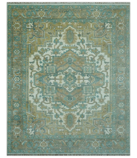 Ivory, Olive and Teal Hand Knotted Traditional Heriz Custom Made wool area rug