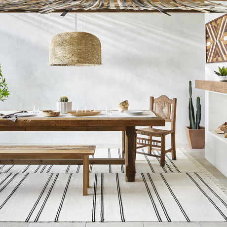 Traditional faded Persians and Oushaks look great under farmhouse tables and add a hint of elegance. If you like natural textures but need practicality, choose jute-look synthetics instead of real jute.