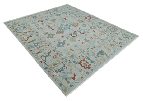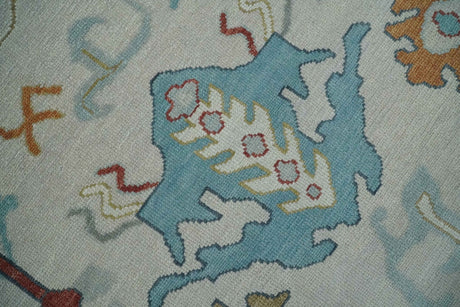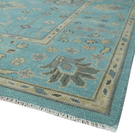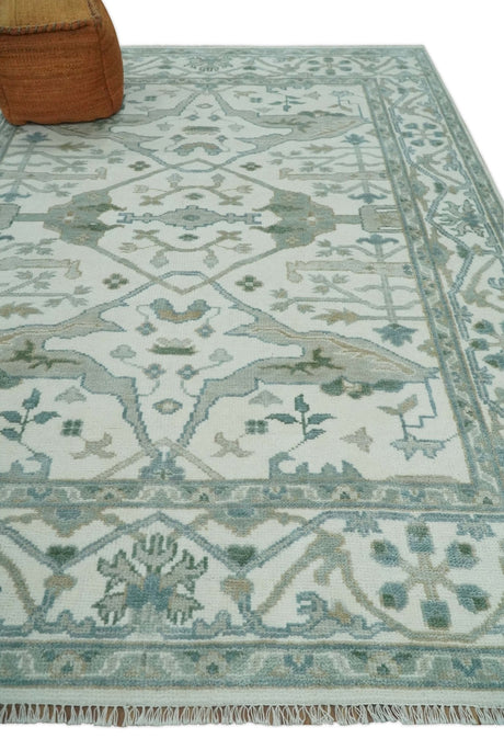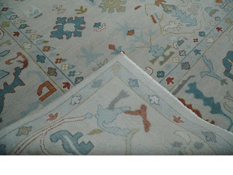 Custom Made Hand Knotted Oriental Oushak Ivory and Teal Wool Area Rug