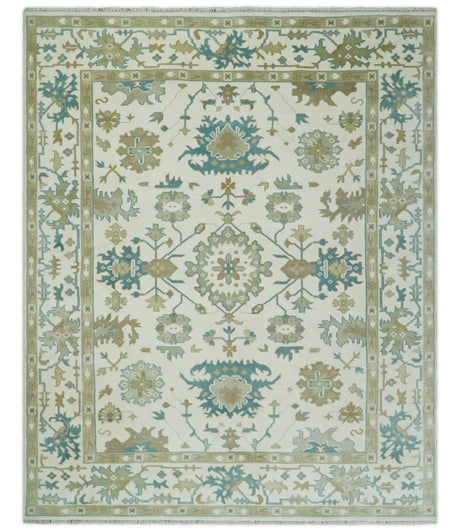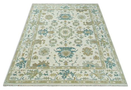 Hand Knotted Ivory, Beige and Teal Antique look Traditional Oushak Multi Size Wool Area Rug