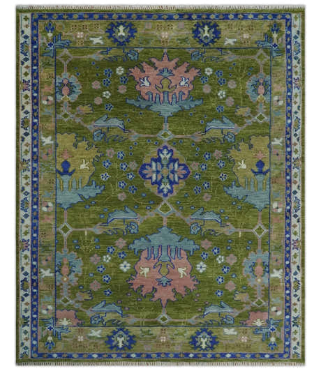 Moss Green, Blue and Peach Hand Knotted Vibrant colorful Donegal Design Multi Size Wool Area Rug
