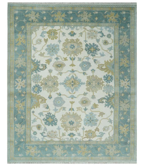 Hand Knotted Ivory, Silver and Blue Traditional Oushak Custom Made Wool Area Rug
