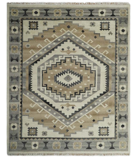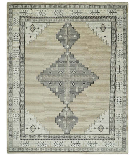 Beige, Blue and Ivory Hand Knotted Traditional Wool Area Rug