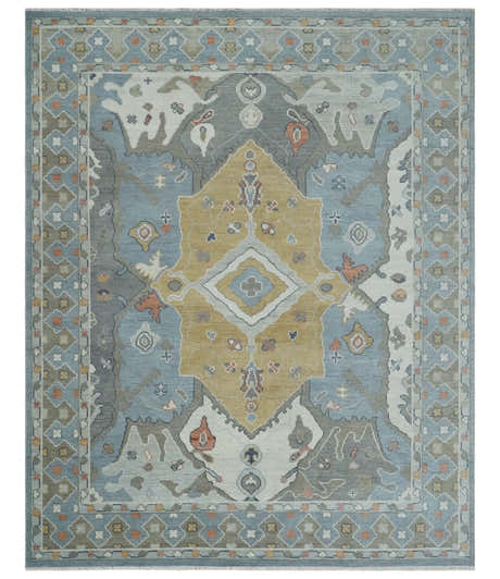 Rust, Blue and Silver Hand Knotted Traditional Multi Size Oushak Wool Area Rug