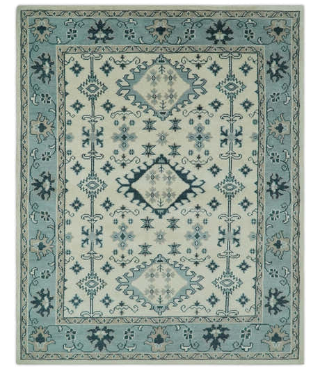 Ivory and Light Blue Traditional Oriental Hand Knotted Custom Made wool area Rug
