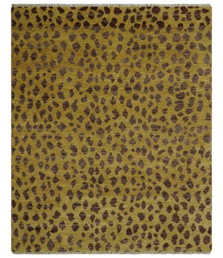 Leopard Design Mustard and Dark Plum Hand Knotted Custom Made wool area rug