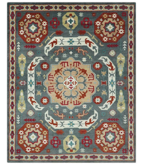 Custom Made Gray, Silver and Green Hand Knotted Traditional Large Design wool area rug