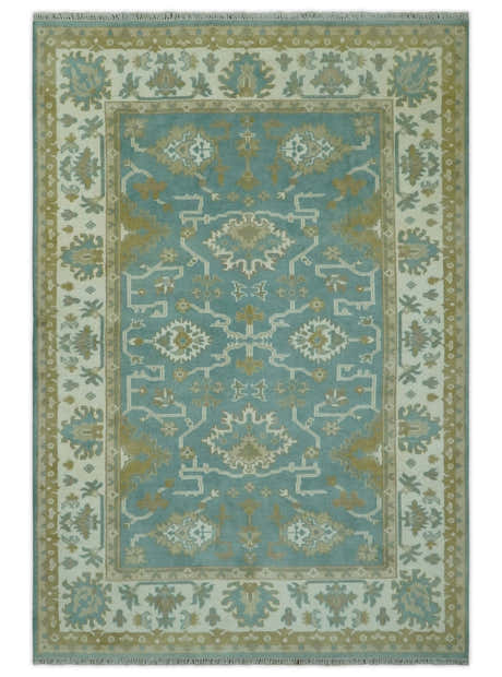 Custom Made Teal, Ivory and Olive Hand Knotted Traditional Oriental Oushak wool rug