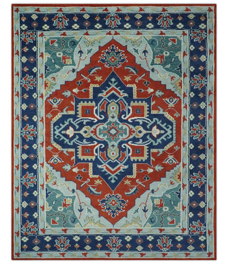 Custom Made Rust, Blue and Silver hand knotted Traditional Heriz wool area rug