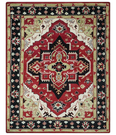 Custom Made Traditional Heriz Maroon, Olive and Black Floral Hand Knotted wool Rug