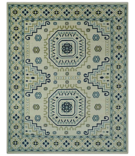 Ivory, Blue and Olive Traditional Mamluk design Custom Made wool area Rug