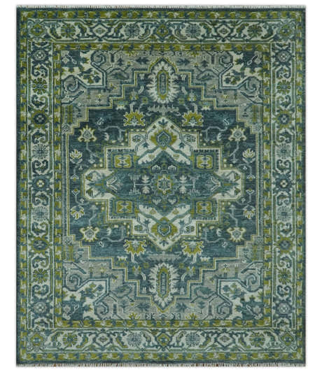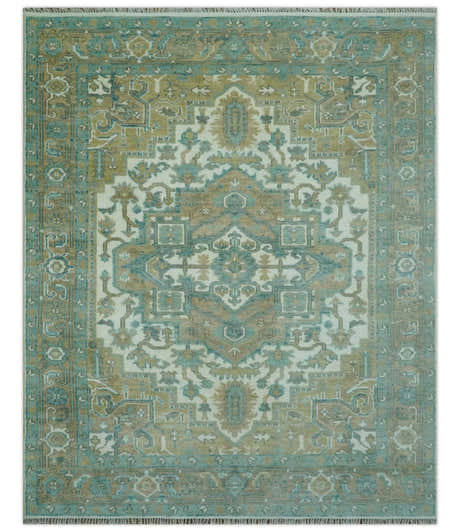 Ivory, Olive and Teal Hand Knotted Traditional Heriz Custom Made wool area rug