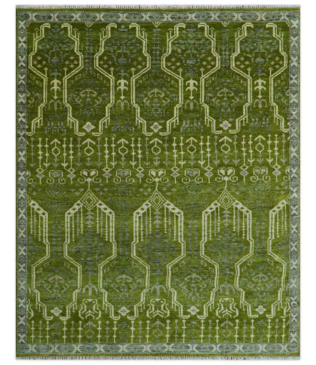Contemporary Traditional Design Green And Beige Hand Knotted Custom Made Wool Rug