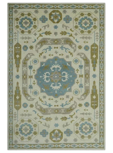 Custom Made Ivory, Olive and Teal Hand Knotted Traditional Medallion Mamluk Design wool Rug