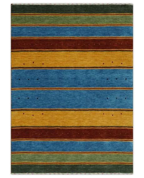 Custom Made Modern Geometrical Blue, Gold, Brown and Green Stripes Design Wool Area Rug