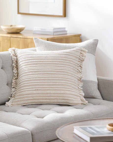 Padrin Tan Fringed Textured Stripe Updated Traditional Cotton Accent Pillow