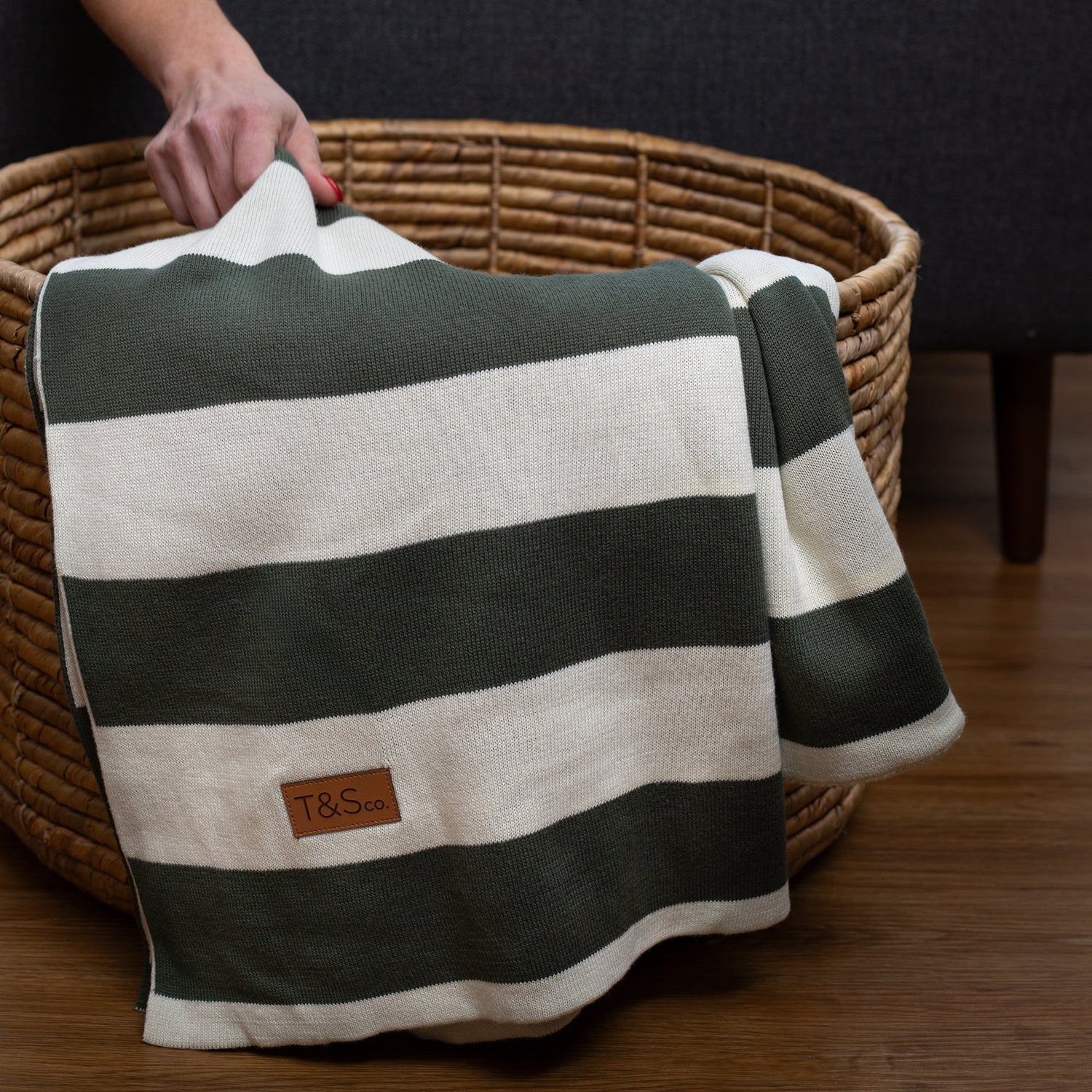 Knitted from 100% mercerized cotton, our throw blankets  feel lush and luxurious but wash like a dream for easy care. The Chunky Stripe design in fir and cream is bold, simple and classic.